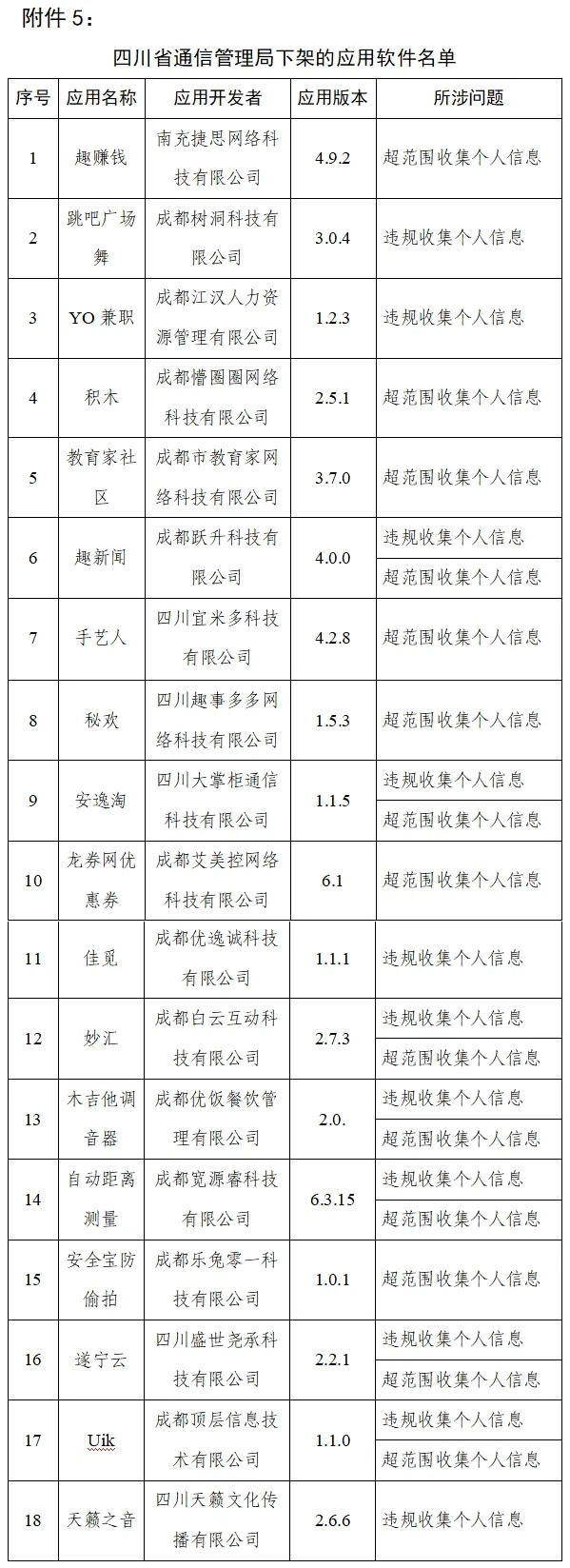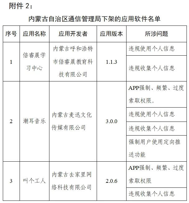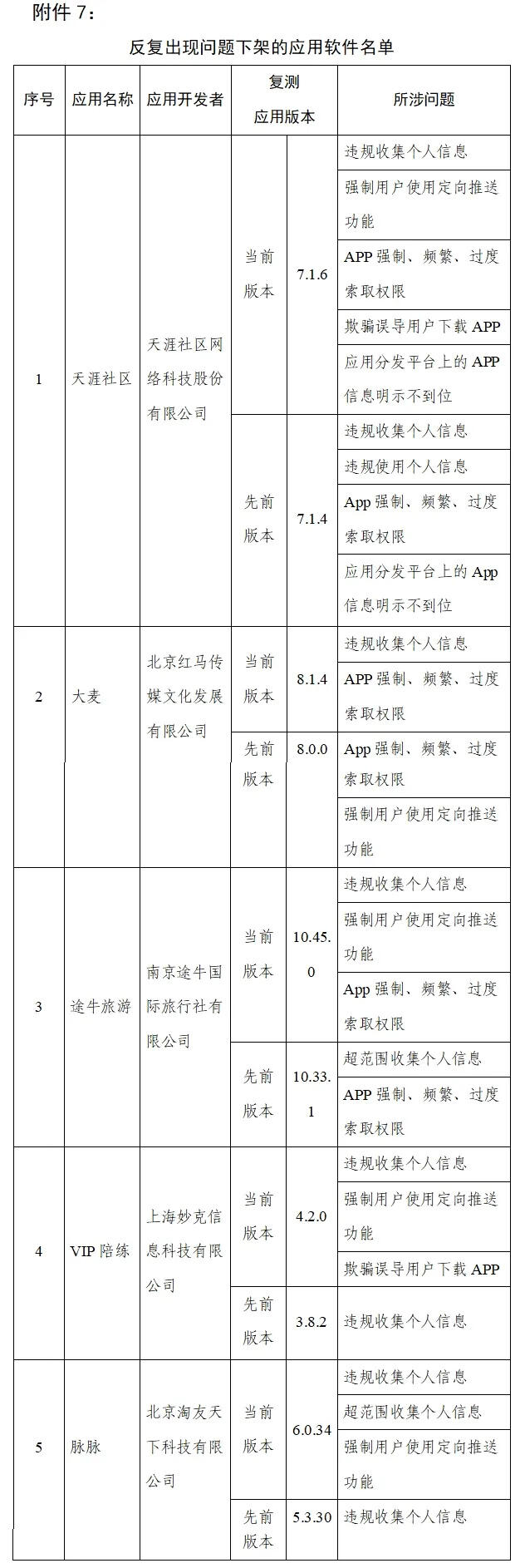 此外,在近期檢測中,工信部發現天涯社區、大麥、途牛旅游、VIP陪練、脈脈5家企業在應用不同版本中反復出現同類問題,工信部表示將依法暫停其違規行為,予以直接下架處理。